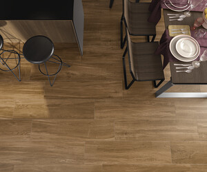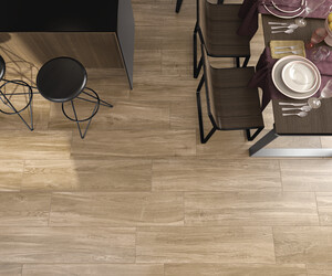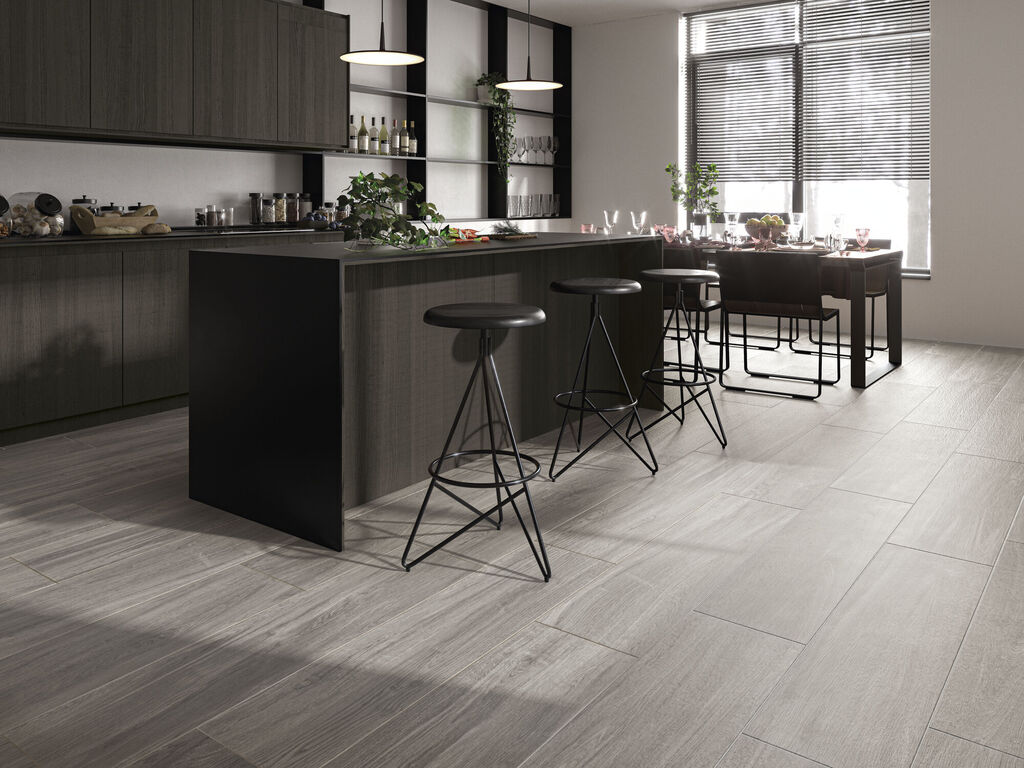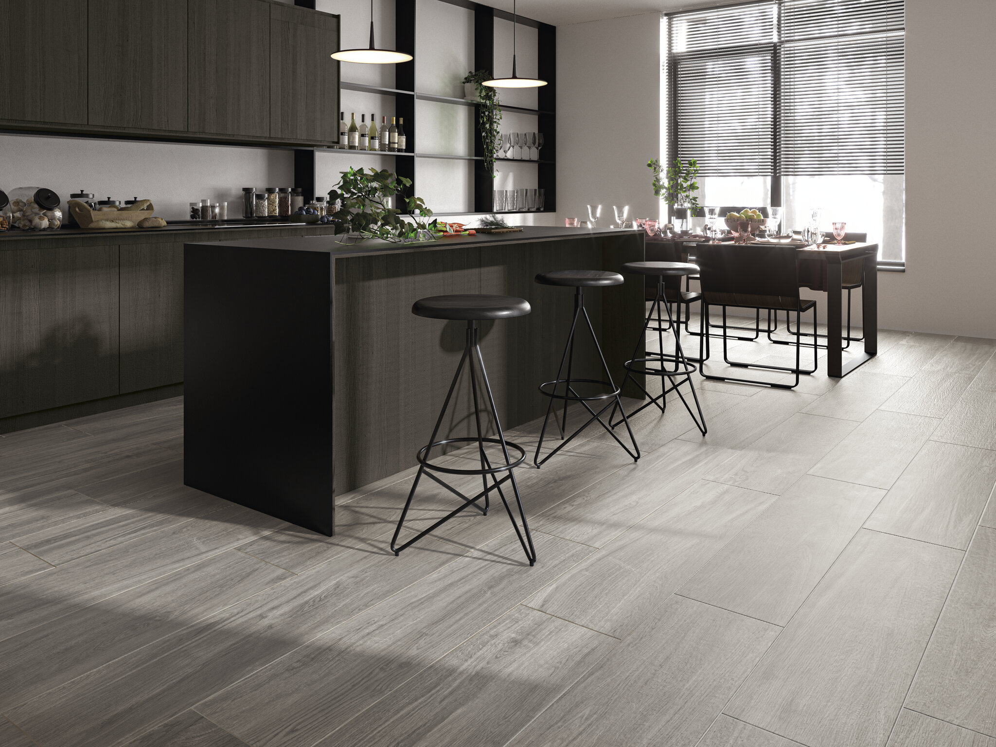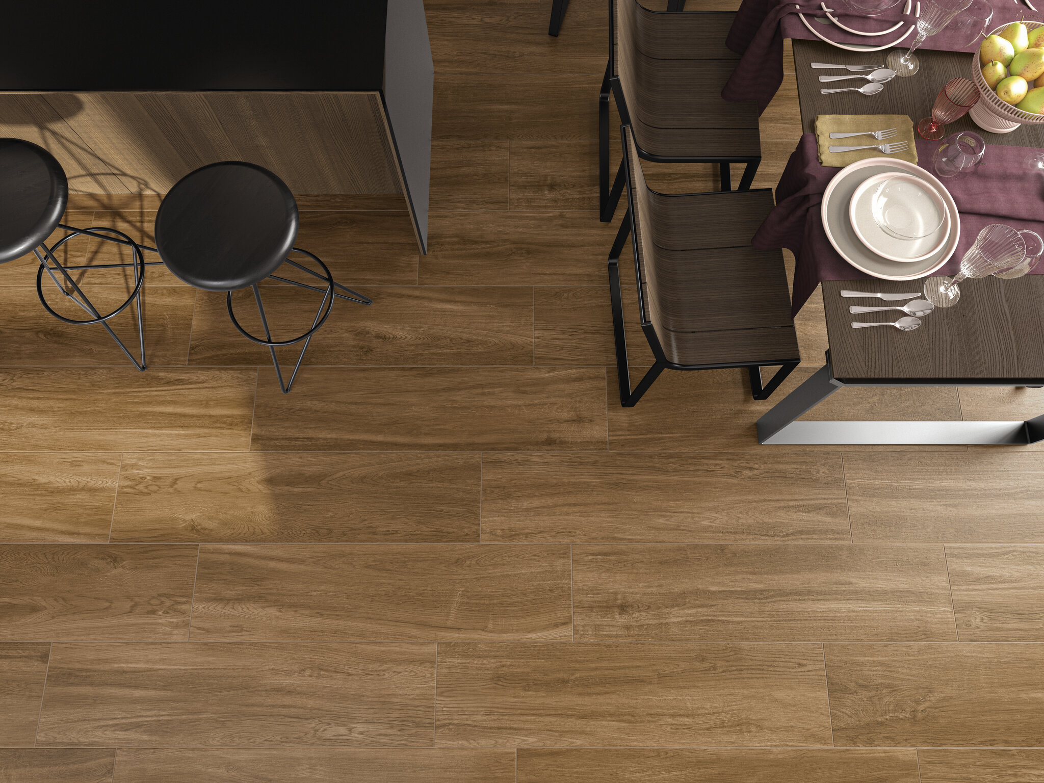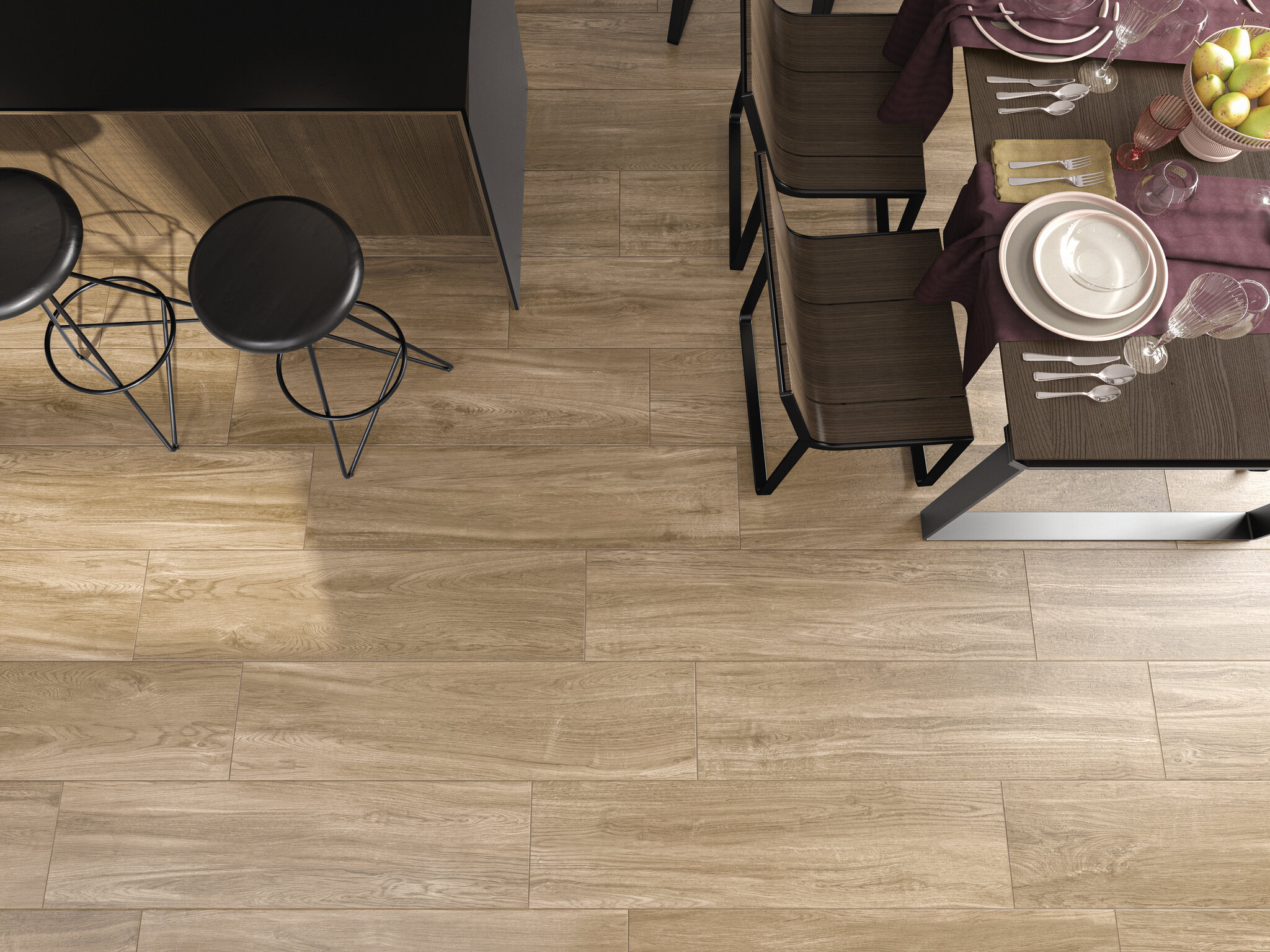 Madera cerámica sobria para espacios atemporales, en formatos cerámicos versátiles.