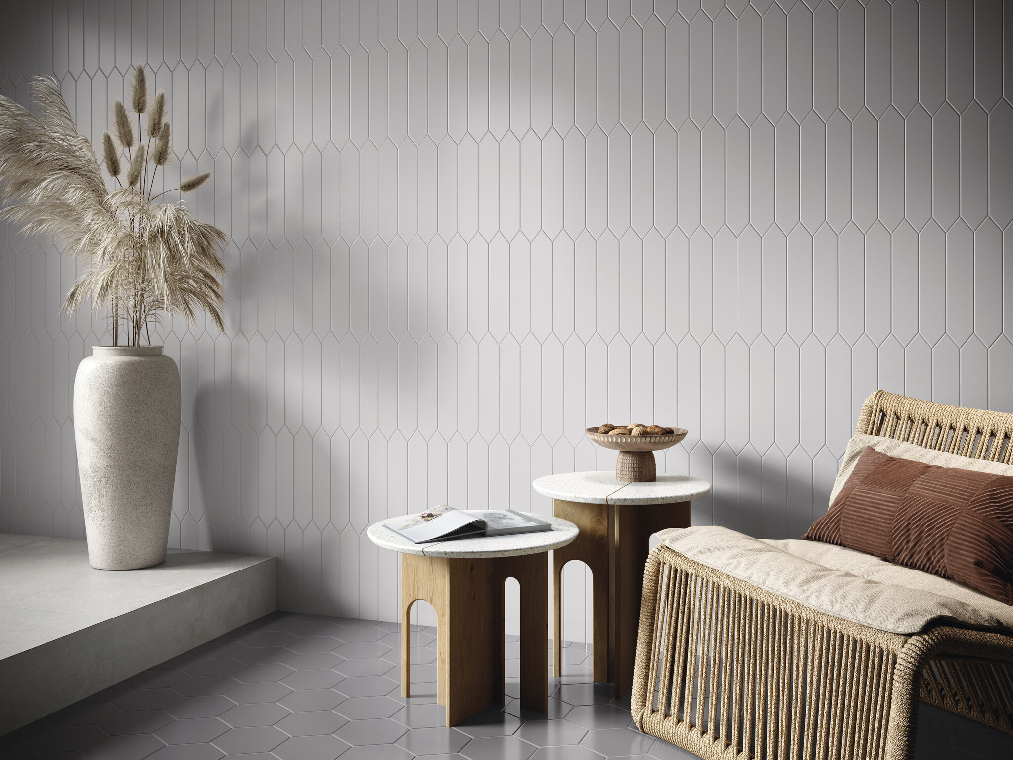 Esta cerámica para muros y suelos de interior incorpora el encanto atemporal de los colores lisos al pequeño formato a través de piezas hexagonales de lo más versátiles. Timeless aporta con su singular forma hexagonal cierto dinamismo a los espacios, que se transforman en ambientes llenos de vida. Las piezas de porcelánico de la serie Timeless se pueden encontrar en ocho colores distintos de acabado mate y se complementa con la forma picket entre sus formatos de revestimiento.