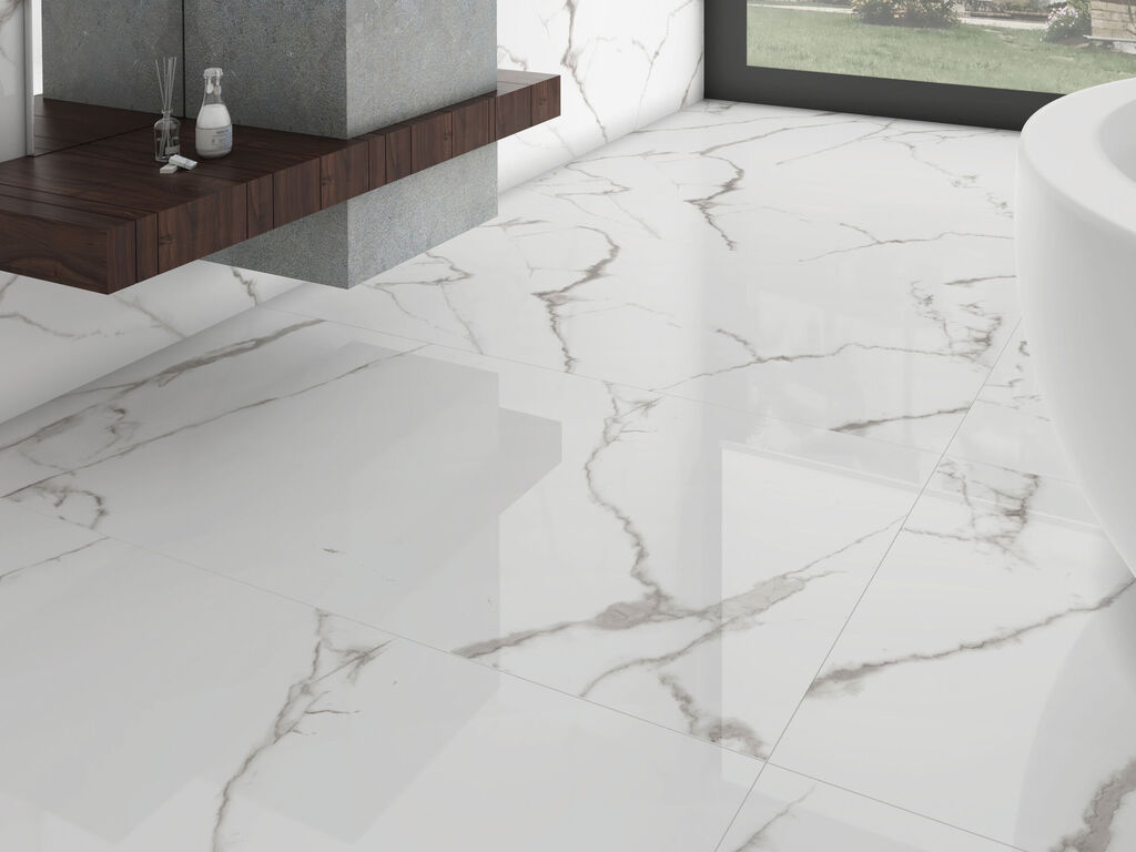 El diseño cerámico recupera la belleza natural del mármol Bianco Carrara y la transforma en una colección de singular encanto