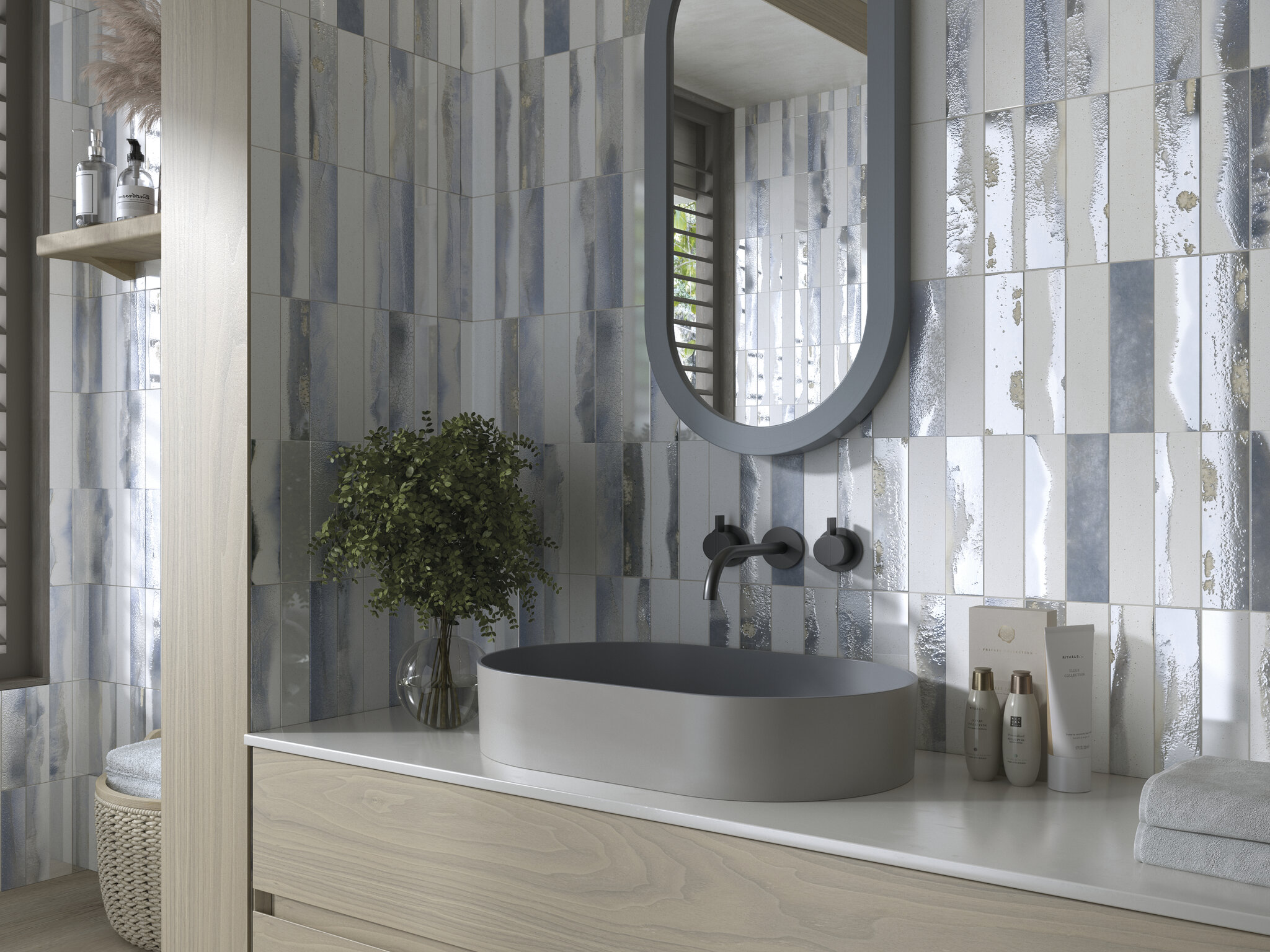 Boubles es una colección que no pasa desapercibida. Con su pequeño formato de 6x25 cm, este revestimiento porcelánico explora la fuerza expresiva del color a través de cuatro tonos intensos —Terra, Green, Blue y Dark— que se despliegan con una fuerte destonificación para crear superficies dinámicas y llenas de matices. Su acabado brillo realza las variaciones cromáticas y el relieve sutil aporta textura y profundidad, generando un efecto vibrante que transforma cualquier pared en un elemento protagonista. Gracias a su carácter versátil, Boubles es ideal para cocinas, baños o espacios comerciales que buscan una cerámica con estilo propio y personalidad marcada. Cada pieza es distinta, cada combinación es única. Con Boubles, el diseño se vuelve emoción.