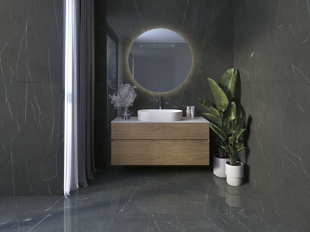 Las delicadas vetas blancas que irrumpen la superficie de esta cerámica diseño mármol negro le confieren un encanto casi fantástico. Este material es idóneo para la decoración de interiores en suelos, paredes, baños, encimeras de cocinas y piezas ornamentales, ya que la combinación del negro con pinceladas blancas resulta perfecta y ofrece un sinfín de adaptaciones estéticas posibles. Esta cerámica estilo mármol de nobleza elegante no deja indiferente a nadie. Ofrece un sinfín de posibilidades a través de sus cinco formatos y acabados brillo, pulido y mate.