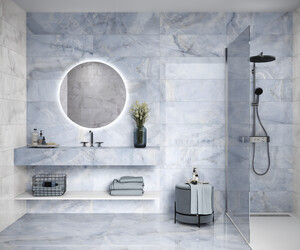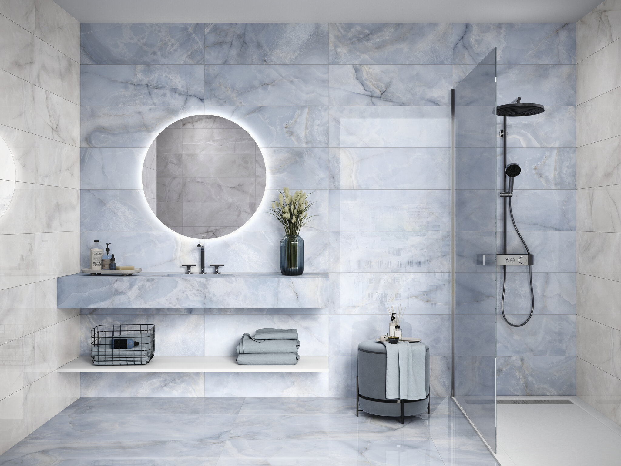 Onix blue brillo 30x90 xs rc. Onix white brillo 30x90 xs rc. Onix blue pulido 60x120 rc. Evolution.