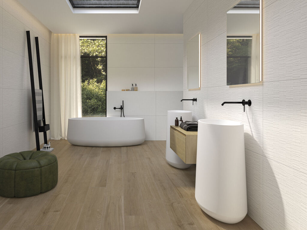 Villore simuliert in seinen Ausführungen so unterschiedliche Materialien wie Zement oder Naturstein und überrascht gleichzeitig mit dekorativen Stücken mit floralen Mustern. Die Grundfarben sind Weiß und Elfenbein mit Zementeffekt. Swan verleiht den Fliesen ein Relief und simuliert kleine,längliche Steine. In der Version Elixir werden die Töne der Verkleidung gräulich oder rosa mit floralen Motiven,die je nach Modell in der Farbe variieren.