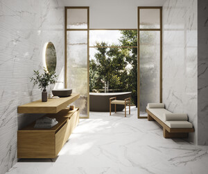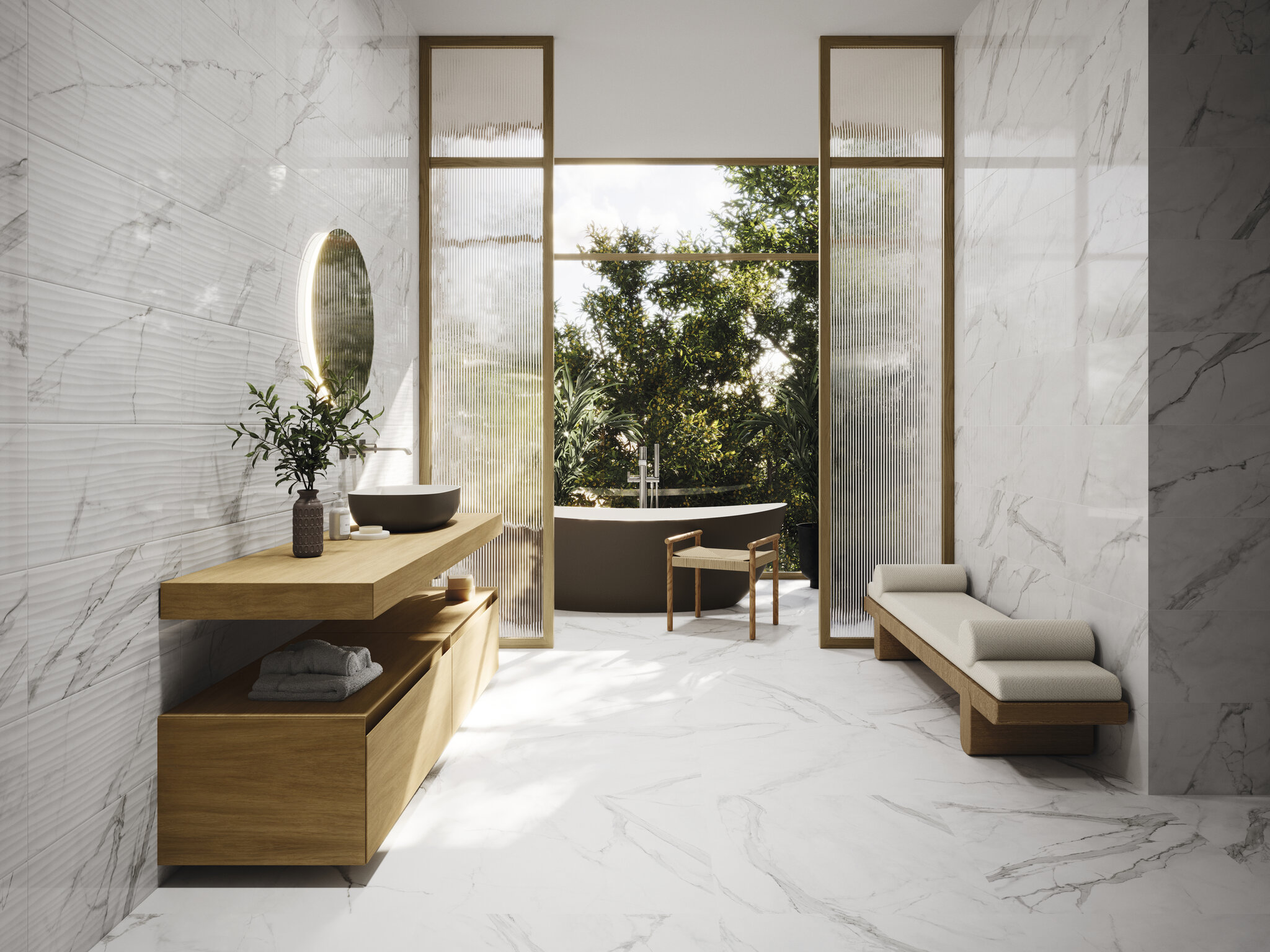 Freya is a series of wall tiles that reproduces the rich veining of marble to create tiles of high decorative value. The shades are interwoven on a white background to reinforce the aesthetic of any space. There are two models available in delicate greyish or golden veins with a gloss finish to further enhance their appearance. In the Lula version, the pieces acquire a wavy relief.