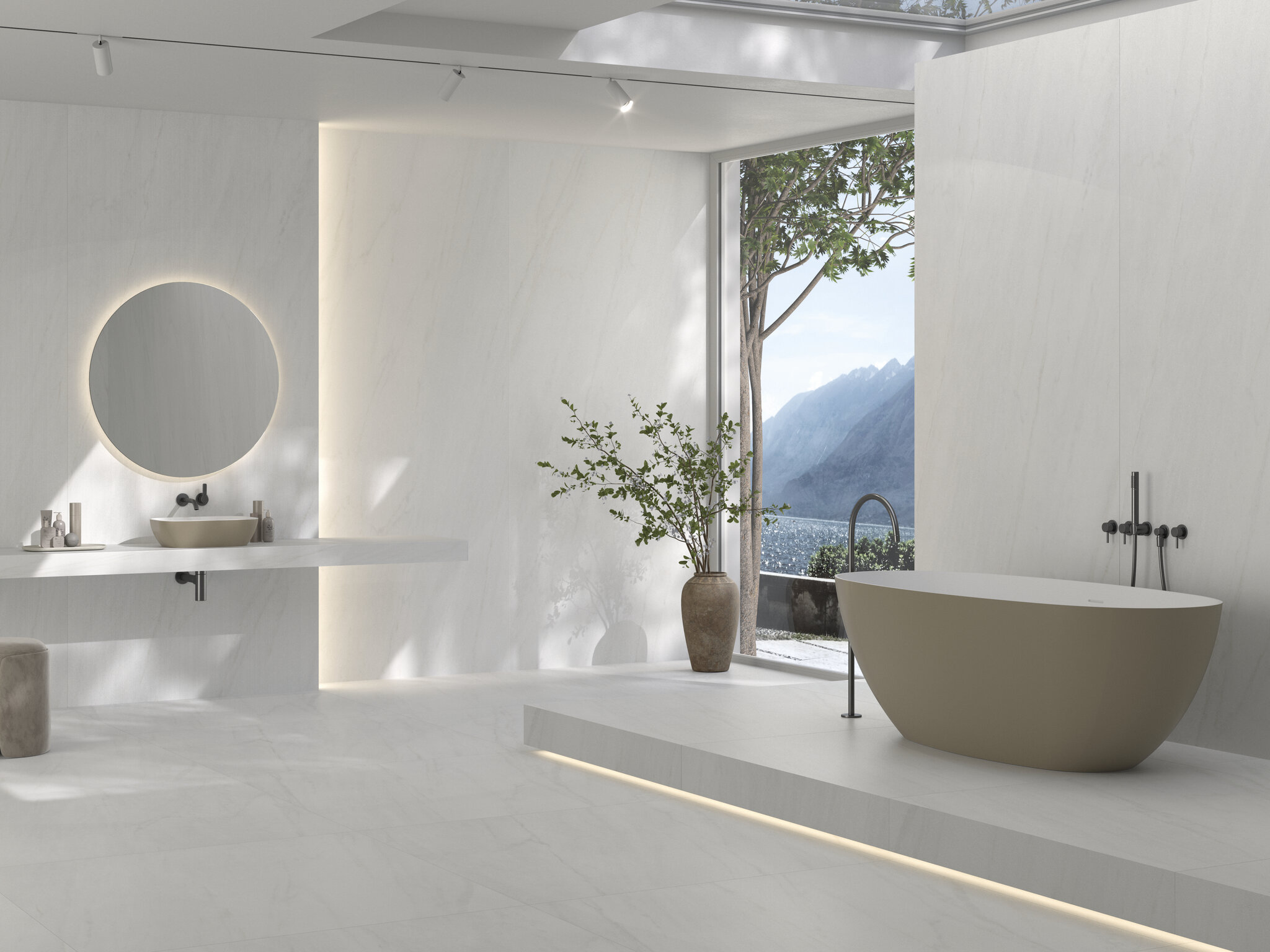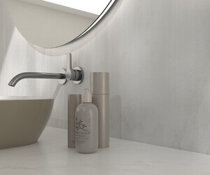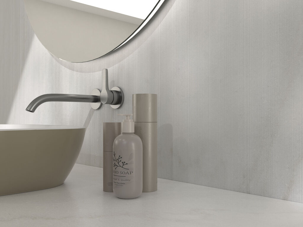 The Nirvana collection is based on a classic reference deeply linked to monumental architecture, reinterpreted from a contemporary perspective. Its surface evokes a light and luminous marble, with a fine and elegant grain, conveying order, serenity and a sense of timeless nobility. The graphic presents a balanced and restrained look, with soft, well-integrated veins that run through the piece without creating dominant directions. Compared to warmer or pinker interpretations of classic marble, Nirvana adopts a slight chromatic neutralisation, providing a more sober and versatile shade, particularly suitable for contemporary projects. Manufactured in rectified porcelain stoneware and available in 60x120, 120x120 and 120x280 formats, the collection allows for continuous surfaces and large-scale compositions, reinforcing its architectural vocation. It comes in a Matt and Polished finish, offering two complementary interpretations of the same material: the Matt, more serene and natural, ideal for contemporary spaces and large surfaces; the Polished, brighter and more refined, designed for projects where greater expressiveness of the marble is sought. In the 120x280 format, Nirvana also incorporates a version with NIOX technology. This mineral effect introduces microcrystals integrated into the mass that generate subtle sparkles and active light behaviour. The surface reacts to light and varies depending on the angle of observation, providing real depth and a lively, not printed, marble feel. NIOX does not decorate the piece: it builds a sensory and architectural experience that elevates the material to a higher category. Nirvana does not reproduce a marble of the past; it reinterprets it to construct contemporary spaces based on calm, light and proportion. With or without NIOX, it is an ideal solution for living rooms, bathrooms, institutional spaces, hotels and projects where the material must convey elegance, permanence and character.