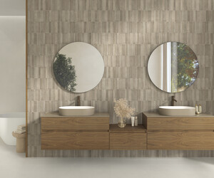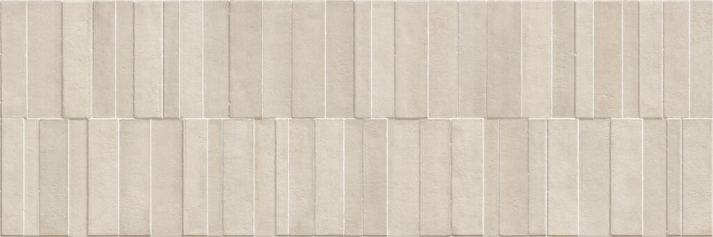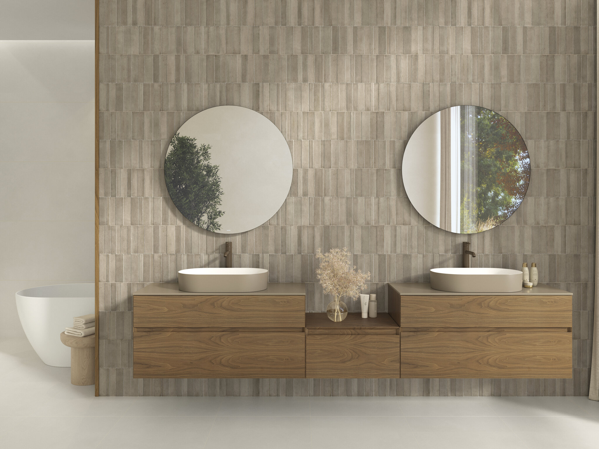 The Slant collection is conceived as a decorative relief cladding designed to construct the wall through direction and texture. Manufactured in white body and in a 40x120 rectified format, it allows for working with large, continuous surfaces with a clean, contemporary look. Its relief is organised around inclined planes and oblique lines, generating a subtle visual rhythm that adds movement and depth without being overpowering. The geometry acts as a controlled architectural resource, capable of transforming the wall through its interaction with light and shadow. Available in three colours —Bone, Sand and Taupe— Slant opts for a palette of neutral and natural tones that facilitates its integration into contemporary interior design projects. These colours reinforce the relief and allow the collection to be combined with other smooth, graphic or more expressive surfaces and materials. Slant are independent and combinable relief coverings, designed as project tools. They work both as a feature wall and as a transitional element, providing texture and continuity without competing with other materials. Slant is an ideal solution for bathrooms, kitchens and commercial spaces, where ceramics are used to define the space through geometry, material and light, with a sober, contemporary and durable language.