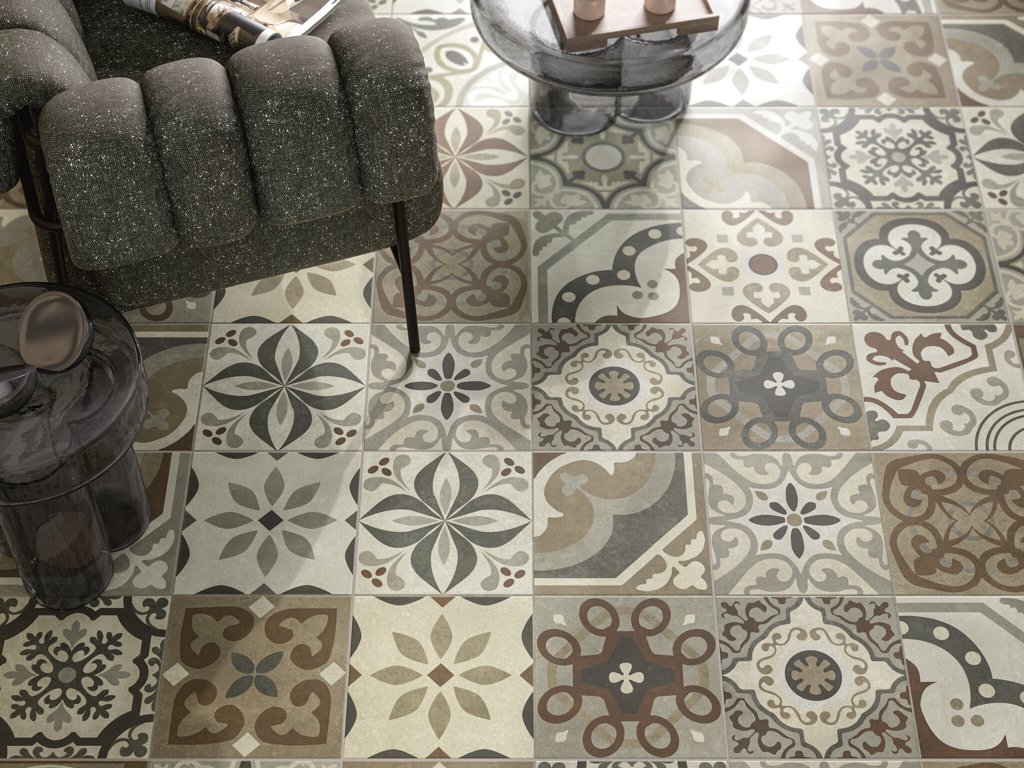 Patchwork est une collection de carreaux hydrauliques décoratifs qui allie tradition et tendance dans un modèle unique au format 45x45. Inspirée des sols artisanaux méditerranéens, cette série rend hommage à l'héritage graphique des anciens pavements hydrauliques, réinterprété dans un style frais et contemporain. Disponible en deux couleurs — Grey, aux tons sobres et neutres, et Mix, aux nuances chaudes et contrastées —, Patchwork transforme n'importe quel espace en un environnement doté d'une identité propre. Ses motifs évoquent le travail manuel d'autrefois et apportent une touche de dynamisme visuel aux sols et aux murs. Fabriqué en pâte rouge, ce carreau est idéal pour les espaces intérieurs, en particulier les cuisines, les salons, les zones de passage et les salles de bains. Sa polyvalence en fait une excellente solution pour créer des ambiances vintage, éclectiques ou d'inspiration bohème. Grâce à son design décoratif multiformat dans un même carreau, Patchwork offre une grande richesse visuelle sans avoir à sélectionner plusieurs références. Une proposition esthétique qui fait des sols décoratifs les véritables protagonistes du projet.