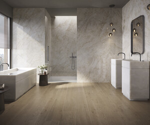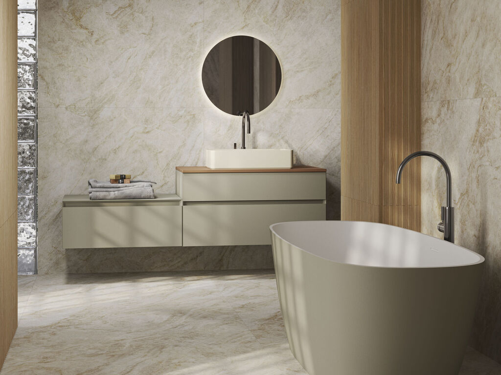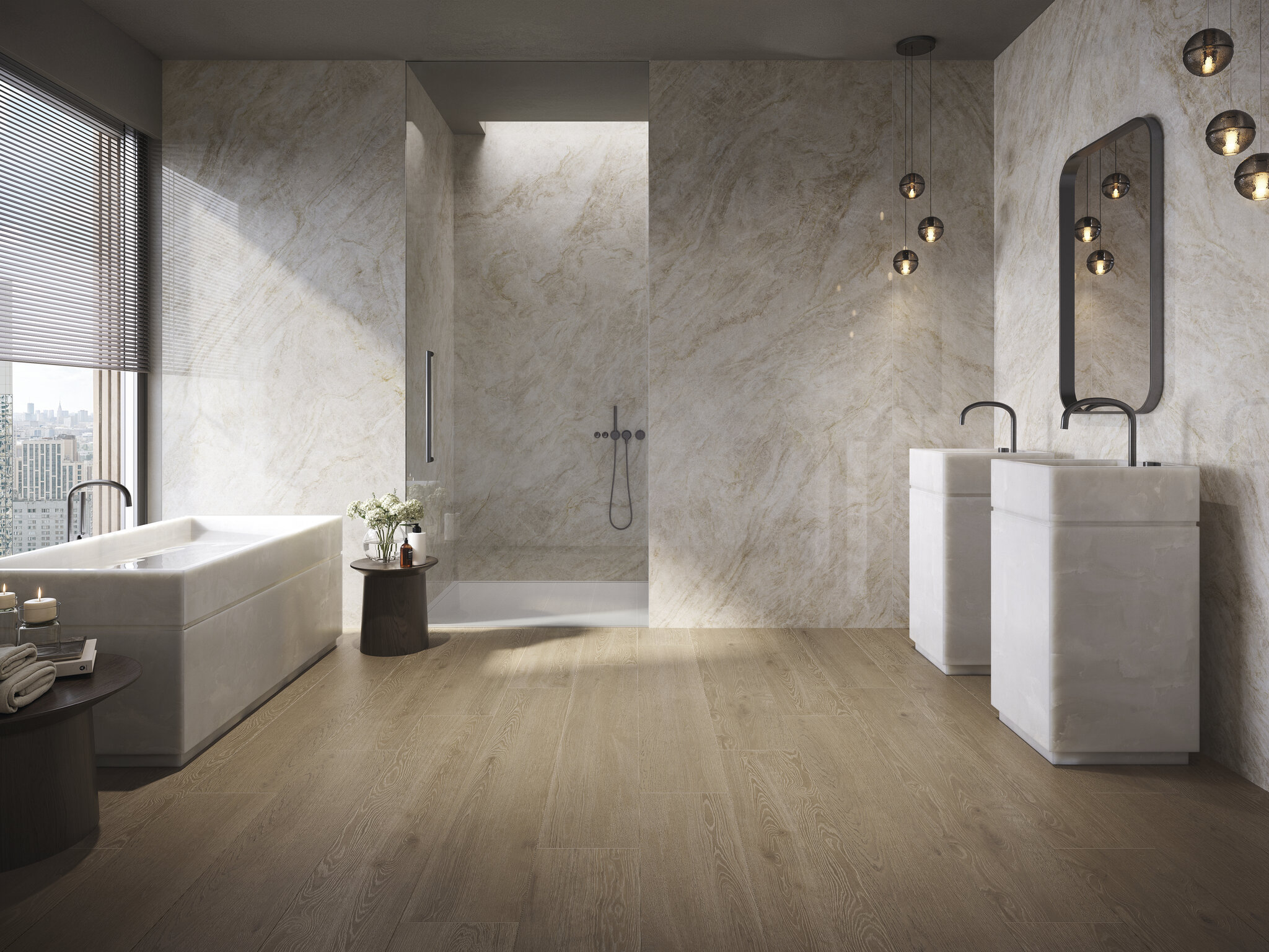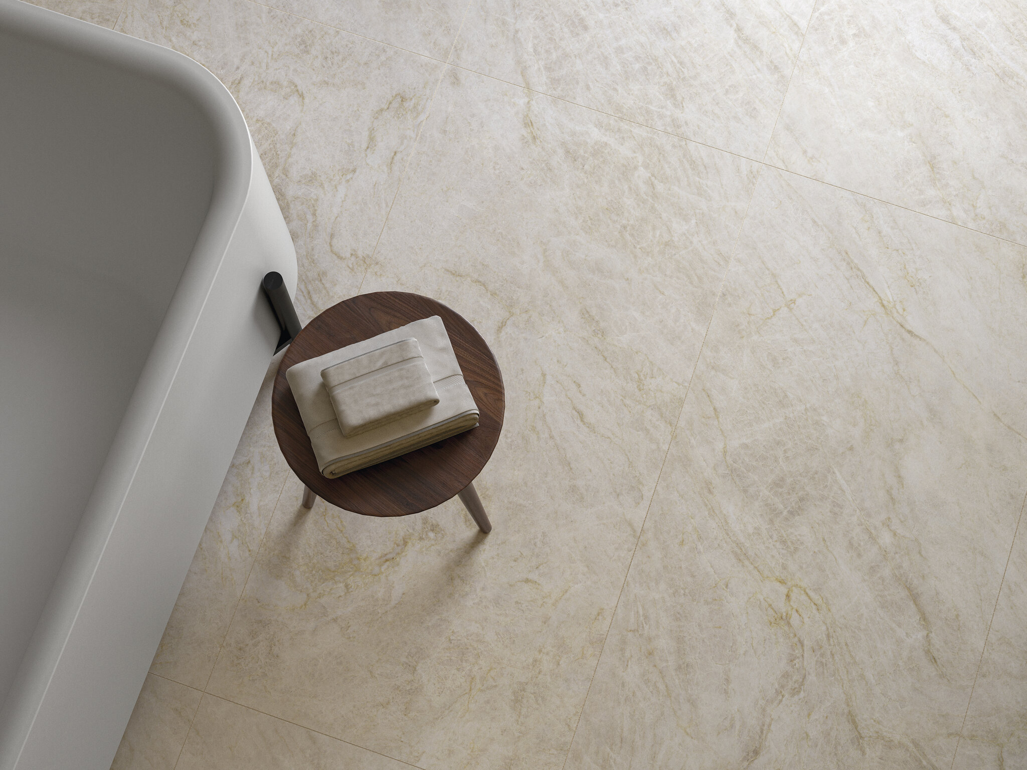 Taj Mahal a été créé en hommage au matériau le plus noble de l'histoire de l'architecture. C'est pourquoi elle doit son nom à l'impressionnant mausolée construit en marbre et considéré comme l'une des sept merveilles du monde moderne. Cette déclaration d'intention se matérialise dans une série de porcelaine de grand format conçue pour donner forme aux intérieurs les plus élégants. Ses trois formats et ses deux teintes neutres (ivoire et beige avec une élégante veinure dorée) lui confèrent une grande polyvalence. Elle est également disponible en deux finitions (polie et adoucie) pour s'adapter à la personnalité de chaque projet.