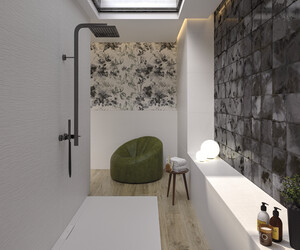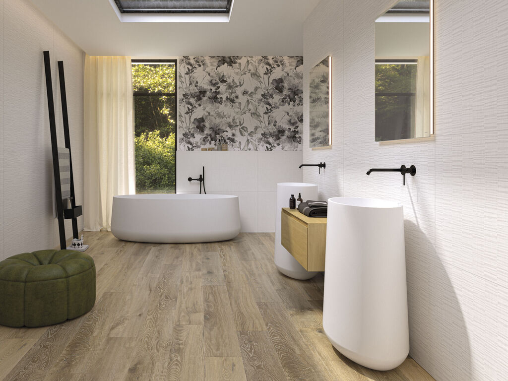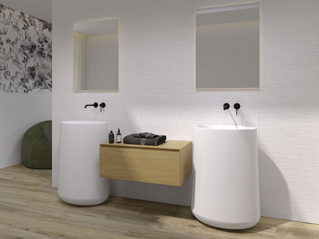 Texture pierre au caractère enveloppant, en céramique de haute qualité pour des ambiances modernes.